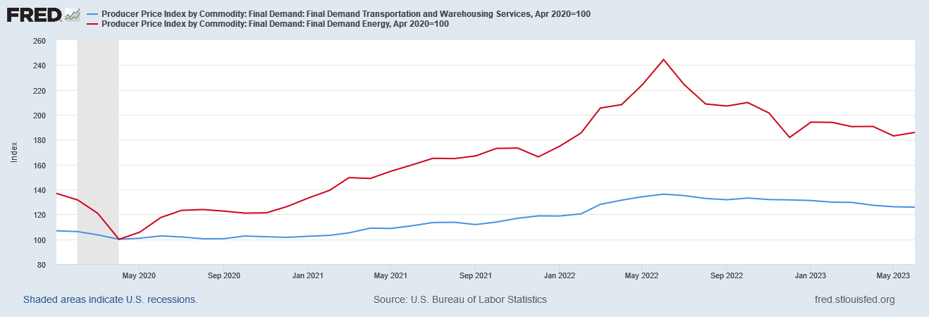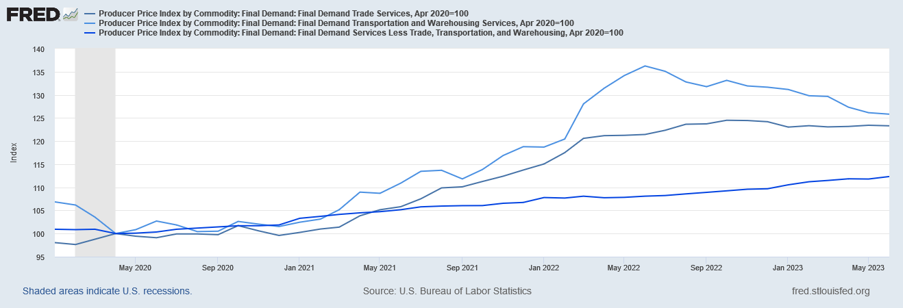 When we look at PPI Final Demand for Services, including trade and transportation and warehousing, we see a slightly different situation. Trade plateaued in March of 2022, Transportation and Warehousing began deflating in June of 2022, yet the Services Less Trade and Transportation shows consistent increase throughout 2022 and 2023 to date.