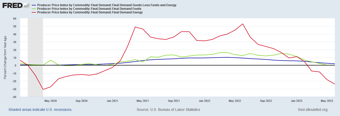 Most notable here is that overall Final Demand for goods printed at 0.1% year on year. From June of 2022 through to June of this year, aggregate producer prices on all goods rose only 0.1%