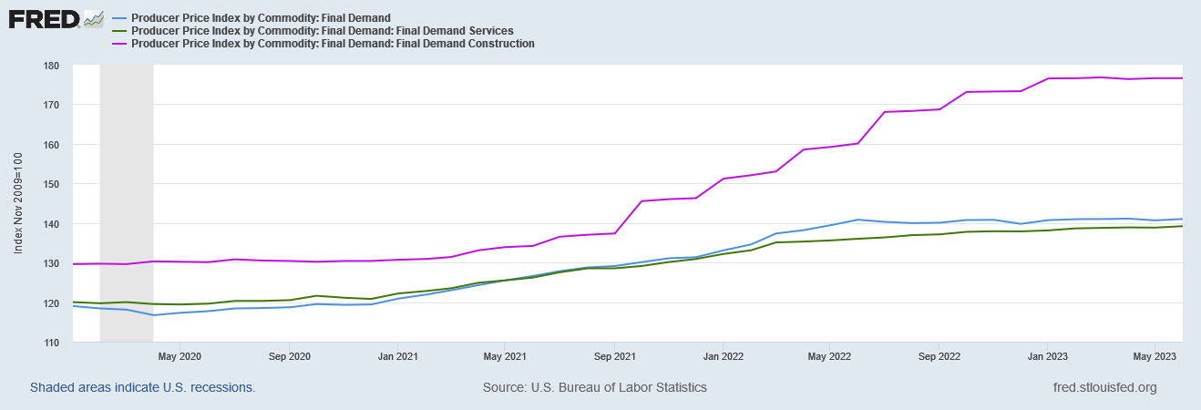 The PPI Final Demand for Services largely plateaued in March of 2022. Overall Final Demand (demand for goods) reached a plateau in May of 2022, and Final Demand for Construction plateaued in 2023.