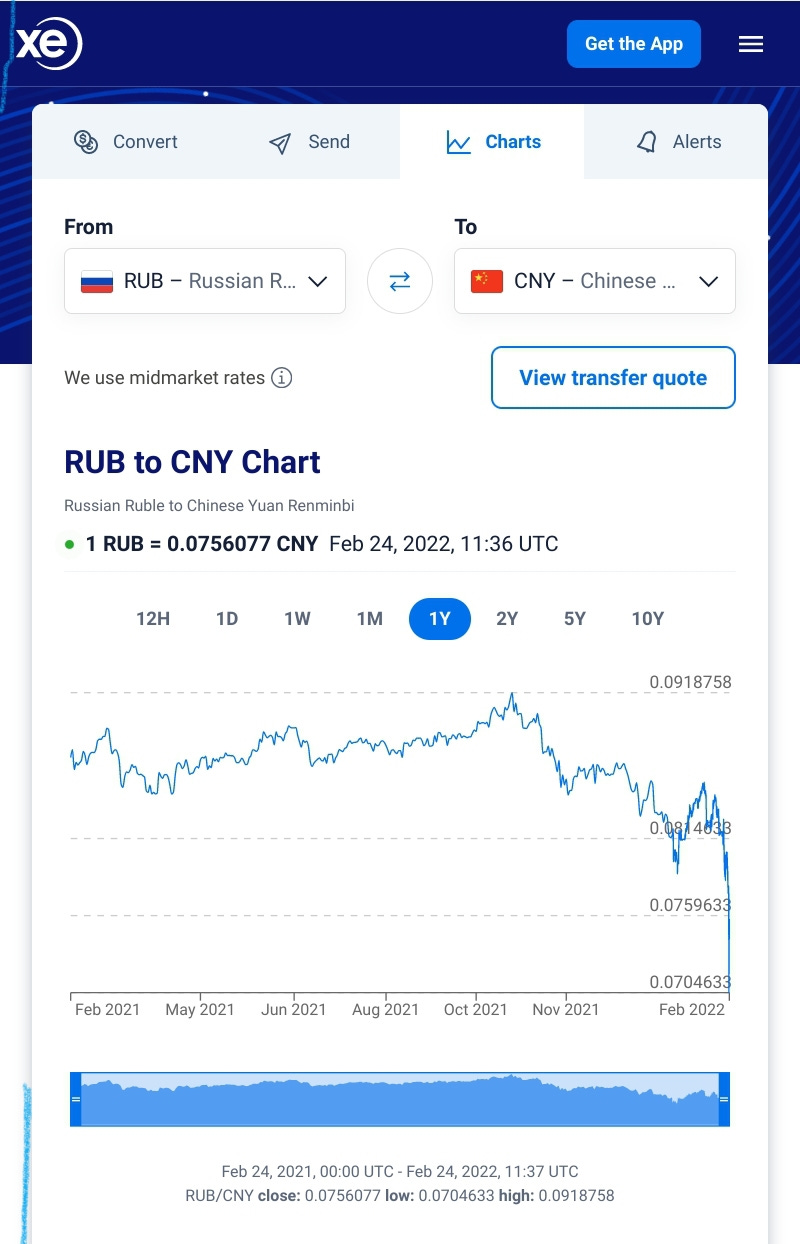 In the wake of inevitable sanctions from the West for its attack on Ukraine, it is worth noting that Russia’s newfound ally against Europe and the US, China, does not seem to be offering much economic comfort, as the ruble has crashed against the yuan just as it predictably has against the dollar and the euro.