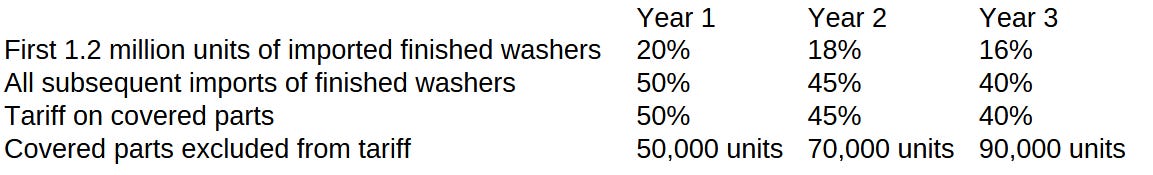 For imports of large residential washers, the President approved applying a safeguard tariff-rate quota for three years with the following terms: