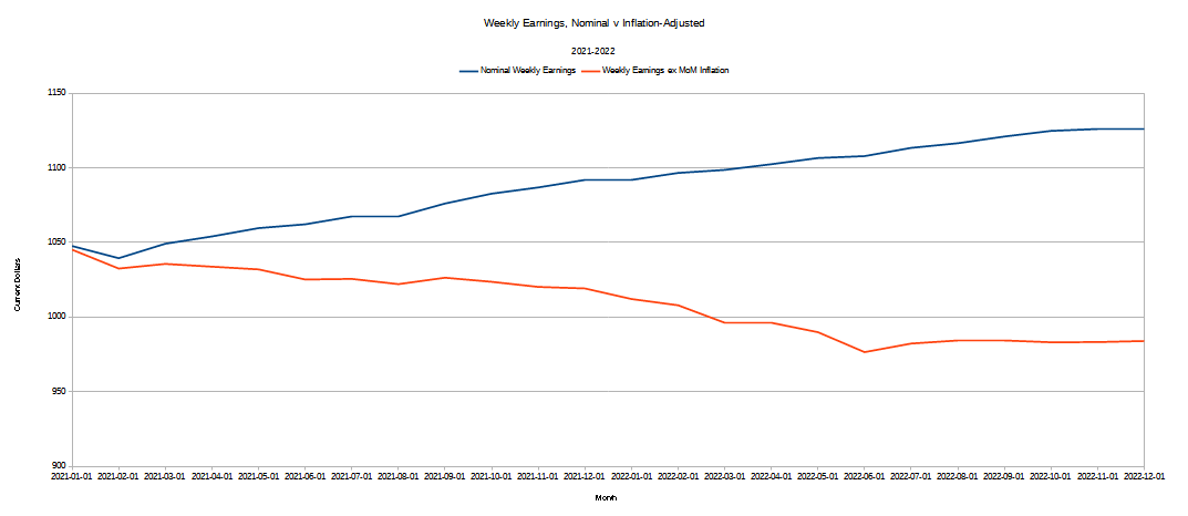 However, when one takes into account the significant inflation we have had throughout 2022, inflation-adjusted wages2 have steadily decreased throughout 2021 and 2022.