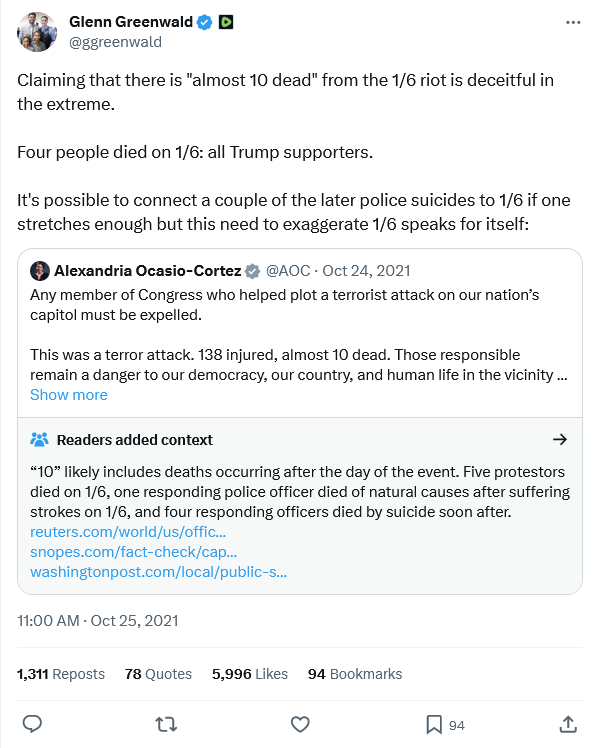 Journalist Glenn Greenwald also took issue on X/Twitter with the exaggerated claims of deaths on January 6, rebutting AOC in particular.