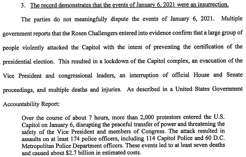 Ms. Bellows has zero regard for fact, however, as demonstrated by her lengthy 34-page decision declaring Donald Trump guilty of insurrection, as she makes a demonstrably false statement of fact in this particular: