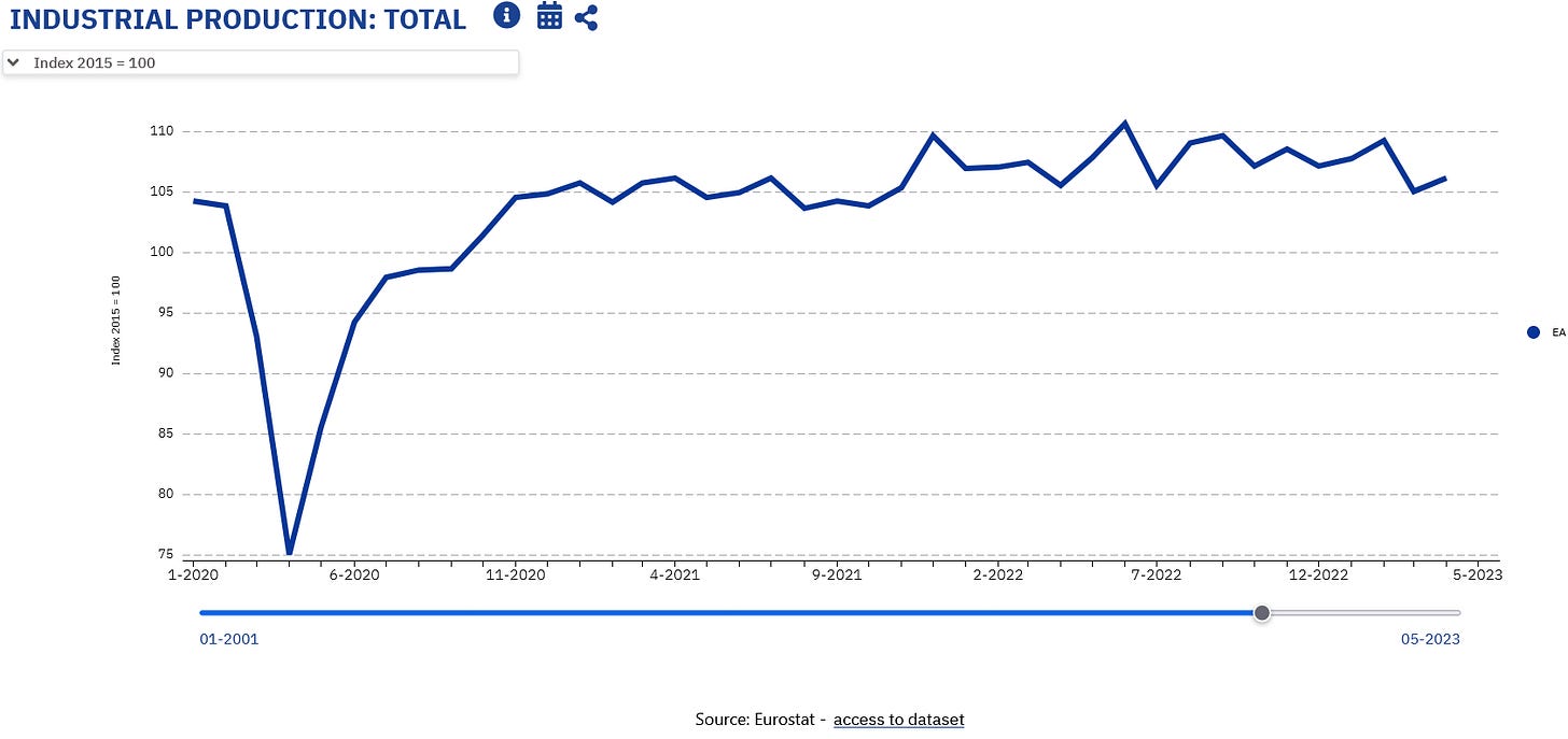 One reason the ECB may feel comfortable with continuing to raise its key interest rates is that, at least outwardly, aggregate euro area industrial production is still expanding, albeit somewhat slowly.