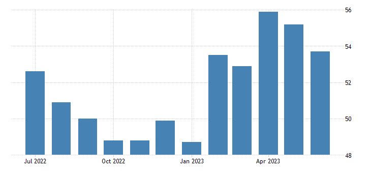 Taken together, manufacturing and services produced a Composite PMI figure of 53, down from 54.3.