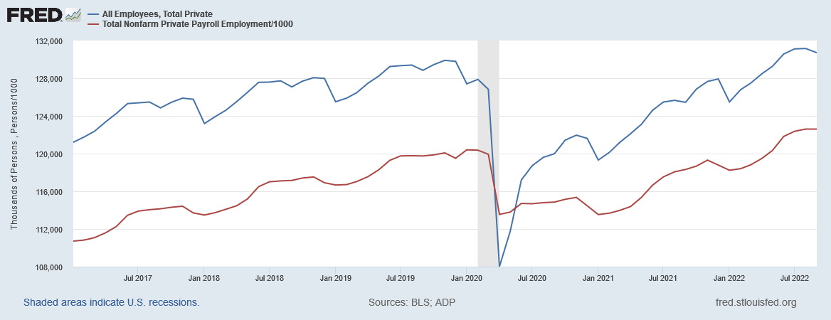 While seasonal variance does account for most if not all of this decline—which is to say that macroeconomic forces are not necessarily involved in the decline—the reality of the raw data is that businesses reported fewer workers in September than in August, both according to the BLS and the ADP Employment Report.