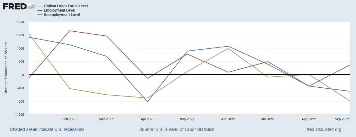 Thus, while employment apparently rose in September, the labor force has been shrinking since the summer. This is the raw data2, and some of that decline is undoubtedly attributable to seasonal fluctuations such as people returning to school after the summer--although a seasonal variance like that does not explain a decline that began during the summer.