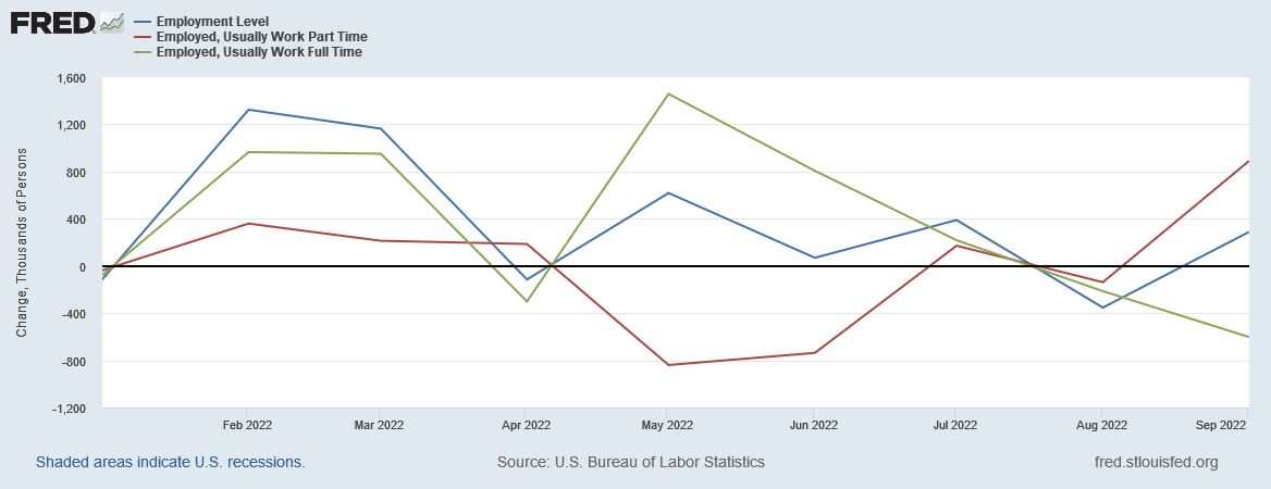Additionally, the second data set within the Employment Situation Summary, the establishment survey3, indicates that overall employment actually declined in September, from 131,156,000 to 130,708,000.