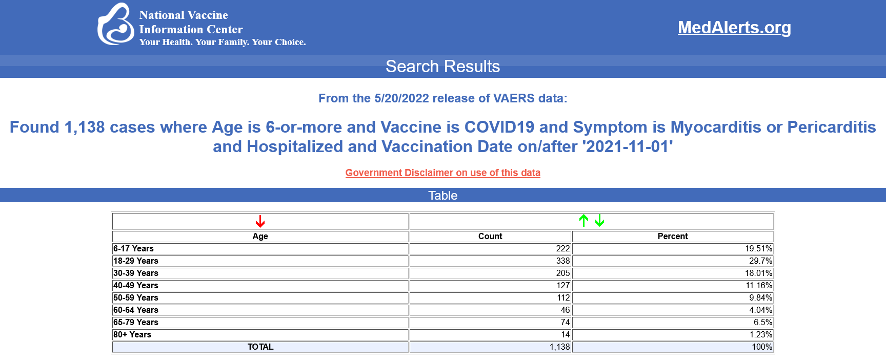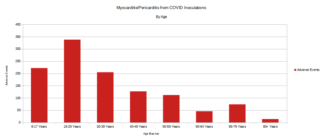 While there are innumerable potential adverse events, one of the most frequently covered by the media has been incidence of myocarditis and pericarditis. When we look at cases of either in VAERS for patients 6 and up since the time the FDA approved inoculation for children age 5 and older—October 29, 2021—one disturbing fact quickly emerges: myocarditis and pericarditis most frequently occur in young people.