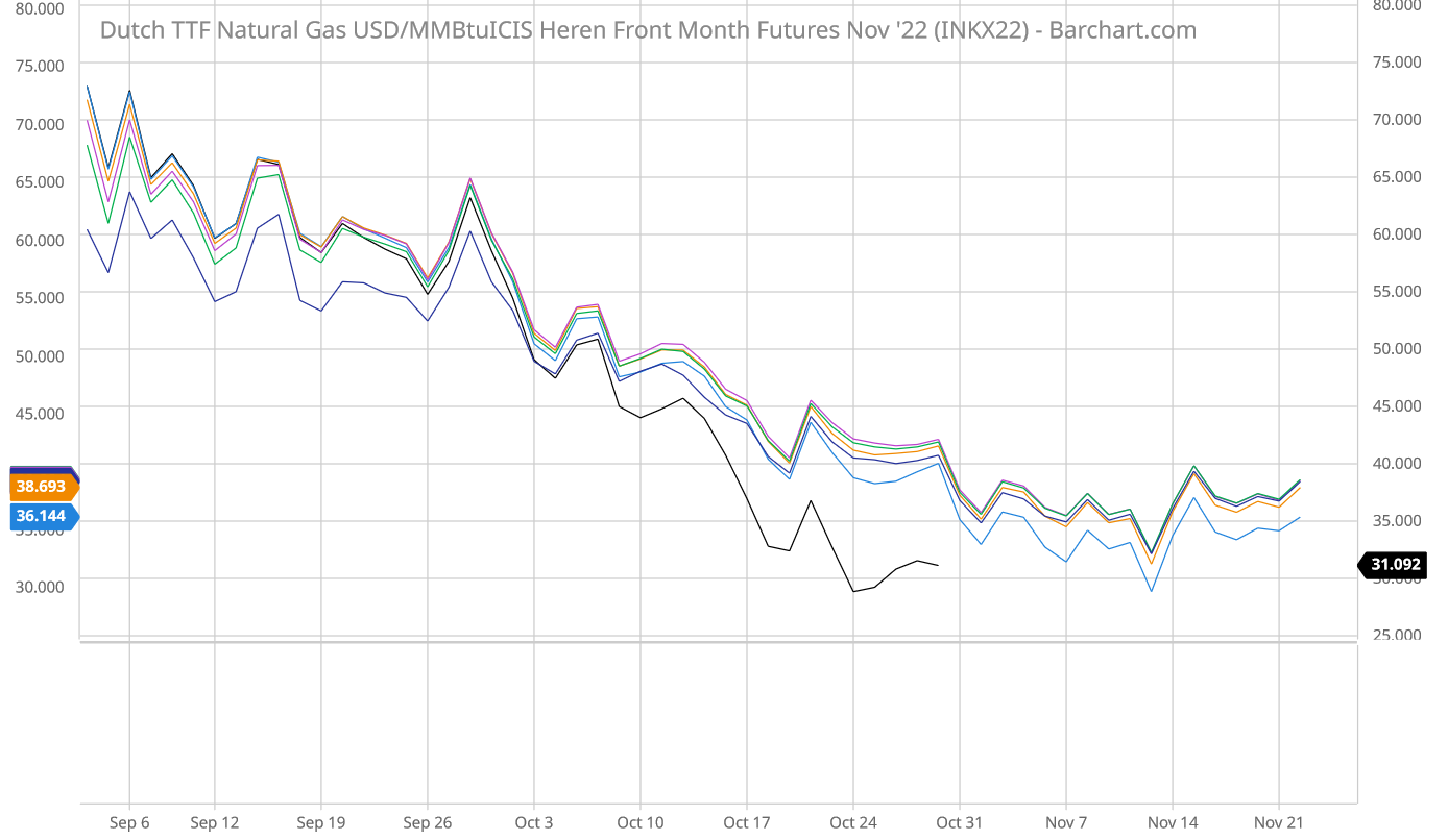 Even forward contracts on natural gas extending through April of next year have only recently begun their seasonal uptick in price, as winter settles in on the continent.