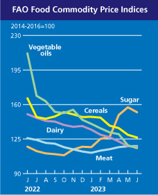 The FAO Food Price Index* (FFPI) averaged 122.3 points in June 2023, down 1.7 points (1.4 percent) from May, continuing the downward trend and averaging as much as 37.4 points (23.4 percent) below the peak it reached in March 2022. The month-on-month decline in the index in June reflected drops in the indices for sugar, vegetable oils, cereals and dairy products, while the meat price index remained virtually unchanged.