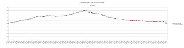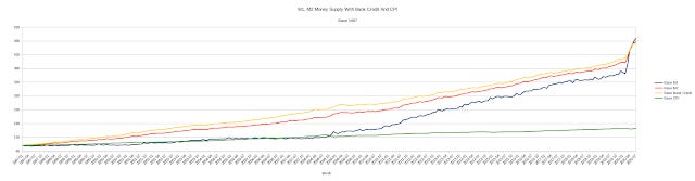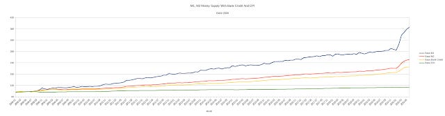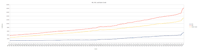 Unsuprisingly, the M2 increases at a generally faster rate than the M1. This is because the inclusion of "near money" means the M2 includes assets that reflect various forms of bank lending, such as various bonds and Treasury bills. The difference between the M2 and the M1 can thus be used as an approximation for the amount of bank lending ("Bank Credit") present in the economy--the third line in the chart above.