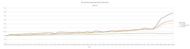 The relative rise in the M1 far exceeds that of the M2 or of the differential bank credit. This distortion becomes more ominous when we consider the relatively flat CPI line, indicating that none of the created money is finding its way into the regular economy.