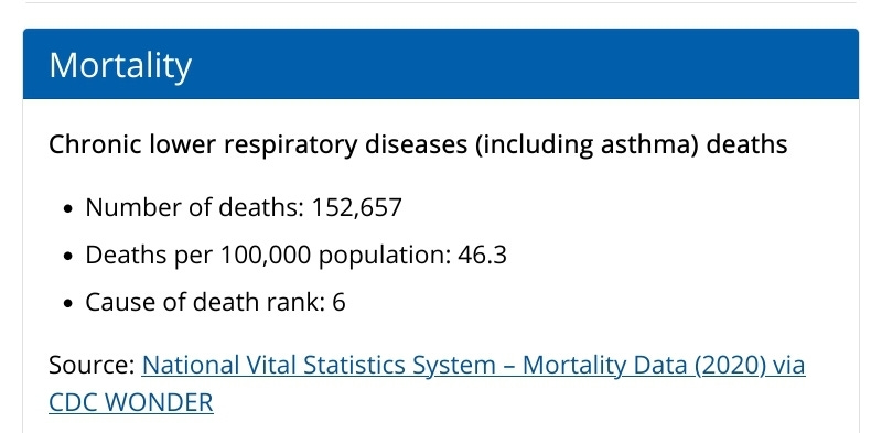 Asthma is classified as a “Chronic Lower Respiratory Disease” by the CDC, which category accounted for 152,657 deaths in 2020: