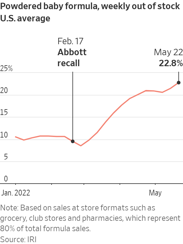 Nationally, 23% of powdered baby formula was out of stock in the week ended May 22, compared with 21% during the previous week, according to the latest figures from market-research firm IRI. In the first week of January and before the recall of formula produced by Abbott Laboratories, 11% of powdered baby formula was out of stock because of pandemic-related supply-chain shortages and inflation. Before the pandemic, the normal out-of-stock range for powdered formula was 5% to 7%, according to IRI.