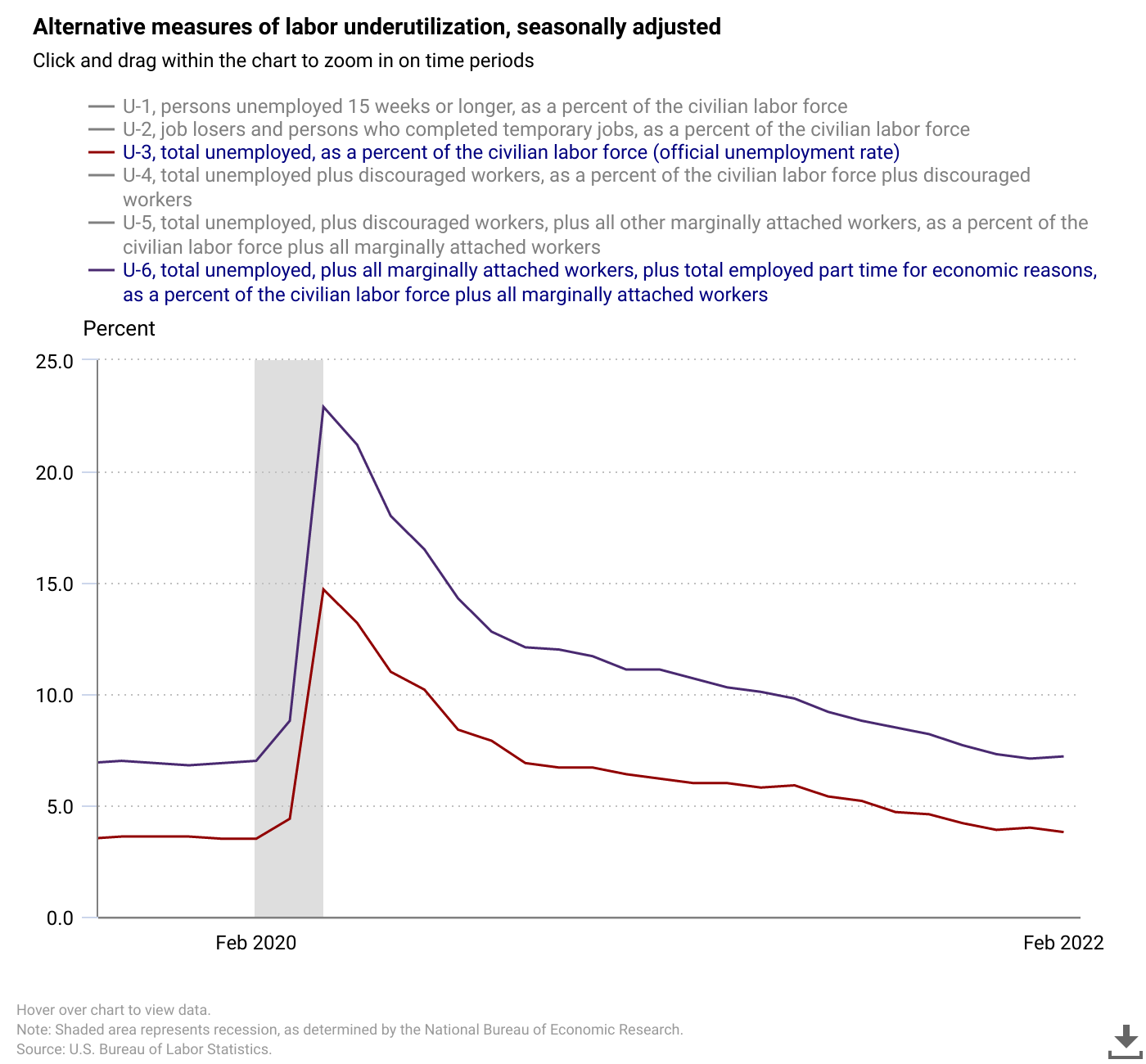 The ramifications of this are made clear by comparing the U-6 labor underutilization rate to the unemployment rate. While the unemployment rate went down in February, the underutilization rate rose to 7.2%