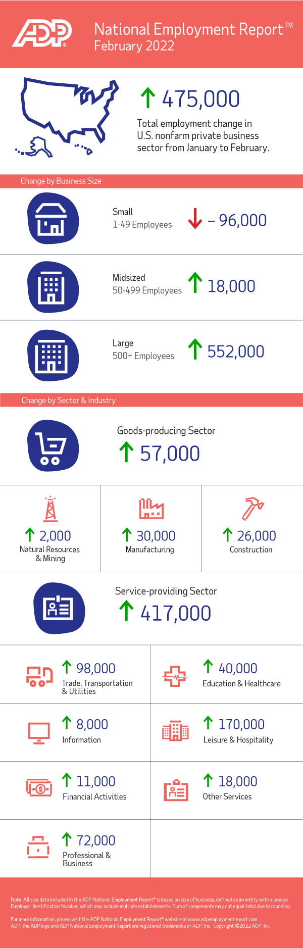 The matched sample used to develop the ADP National Employment Report was derived from ADP payroll data, which represents 460,000 U.S. clients employing nearly 26 million workers in the U.S. The January total of jobs added was revised from -301,000 to 509,000.