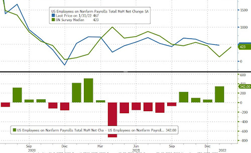 Consensus expects the February jobs report at 8:30am ET to show nonfarm payrolls increase of 423k vs 467k in January, with the Bloomberg crowd- sourced whisper number slightly lower at 401k. Notably, the pace of hiring is expected to confirm Fed’s assessment that the labor market is strong enough to withstand rate hikes. The unemployment rate is expected to decline to 3.9%.