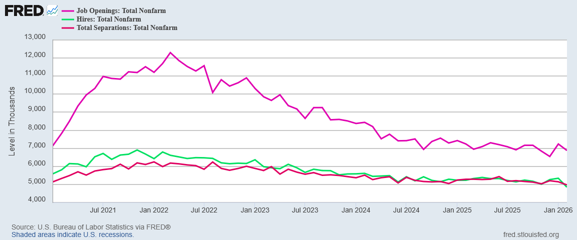 Now the February report is out, and we have our answer. February’s JOLTS report shows the job recession getting worse, although the Bureau of Labor Statistics does its usual job of obfuscating that reality.