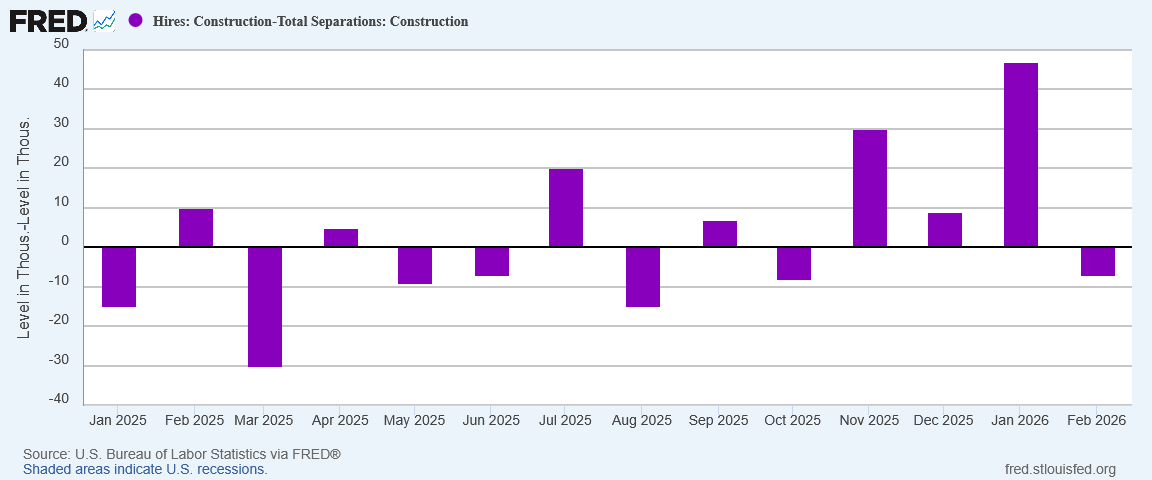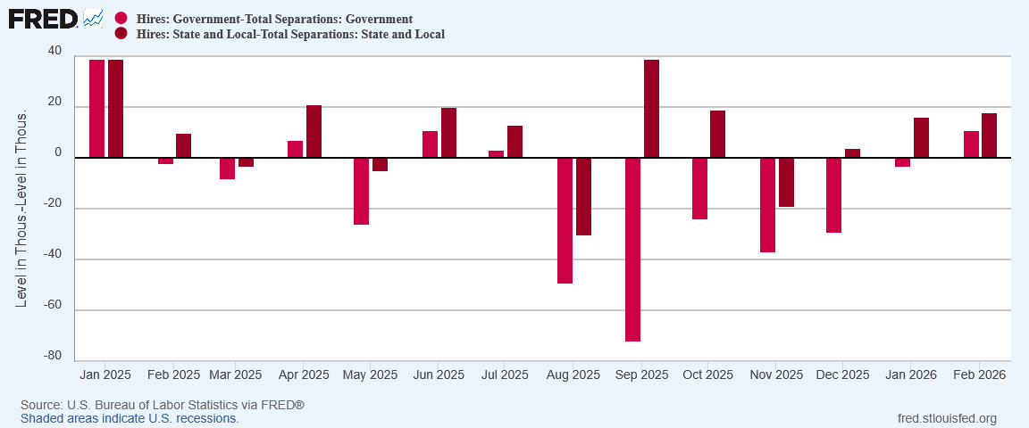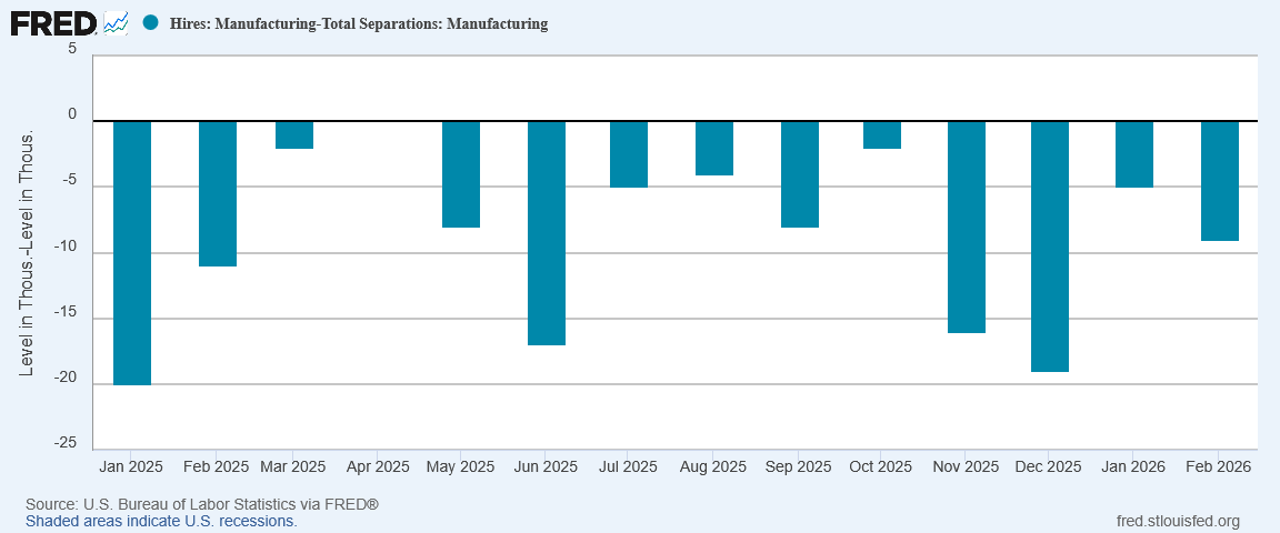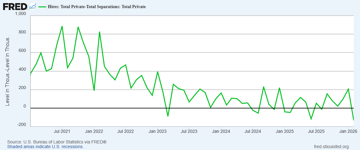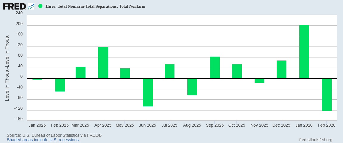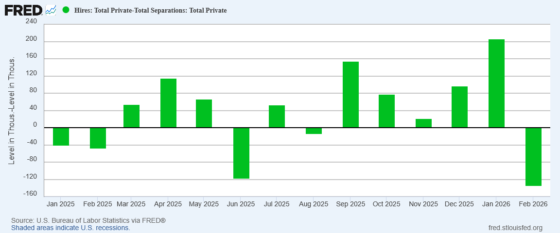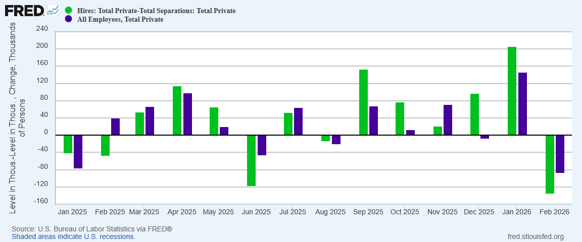 With hiring dipping below the level of separations, net hiring went negative (again).