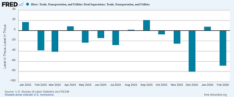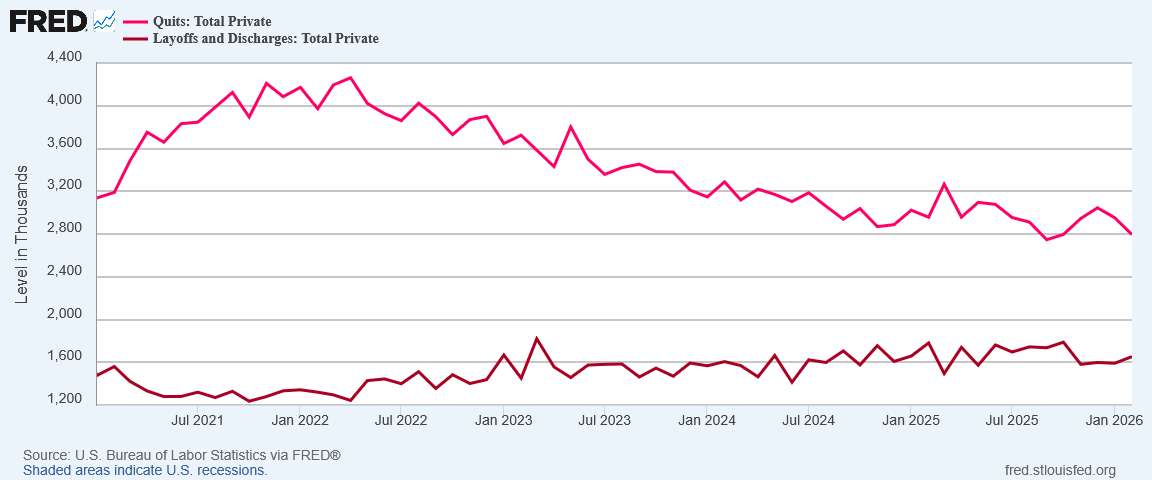 The steady decline in “quits”—voluntary separations—relative to layoffs and terminations has been another indication that labor markets were getting progressively softer, less healthy, and more toxic.