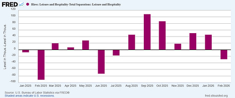 “This is a hiring recession,” Long wrote in a social media post. “And Americans are feeling it. There were notable hiring pullbacks in February in hospitality and construction. Bottom line: The job market was already frozen before the war in Iran began. It’s worrying that a ‘no hire, no fire’ situation could turn into a ‘no hire, start to fire’ job market quickly if there isn’t a resolution soon.”