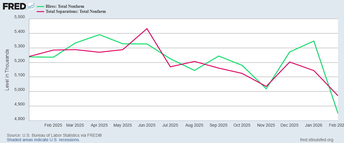 As if to add insult to injury, corporate media also took pains to point out that the hiring rate on the February JOLTS was the worst since the COVID Pandemic Panic—and of course it was all President Trump’s fault (even though most of the decline from peak hiring in 2022 happened under Joe Biden).