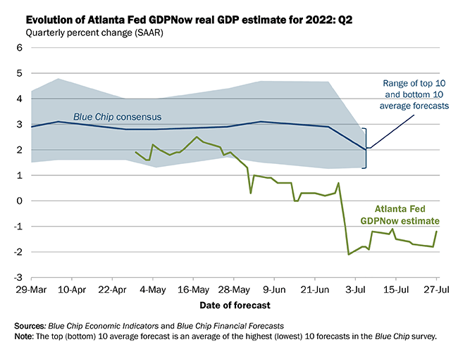 The GDPNow model estimate for real GDP growth (seasonally adjusted annual rate) in the second quarter of 2022 is -1.2 percent on July 27, up from -1.6 percent on July 19. After recent releases from the US Census Bureau and the National Association of Realtors, the nowcast of the contribution of inventory investment to second-quarter real GDP growth increased from -2.50 percentage points to -2.30 percentage points, while the the nowcast of the contribution of the change in real net exports to second-quarter real GDP growth increased from 0.18 percentage points to 0.59 percentage points.