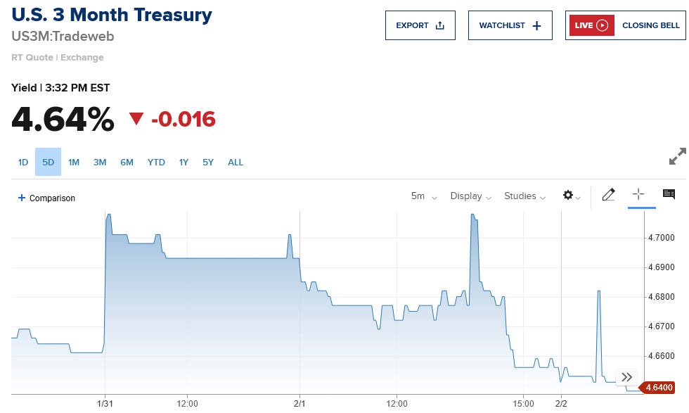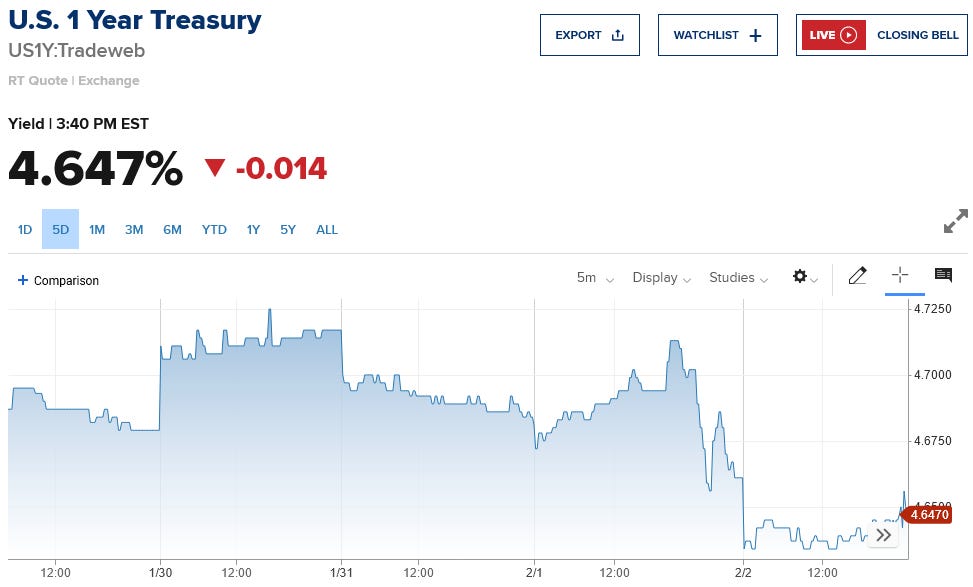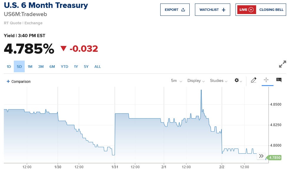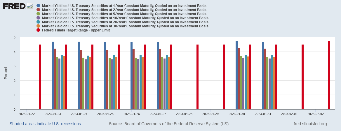 One interesting point to note about Treasury yields: as of this writing, these declines mean that only the 6-month note has a yields above the Fed Funds rate. All other maturities have a yield less than the upper limit of the Fed Funds rate (4.75%).