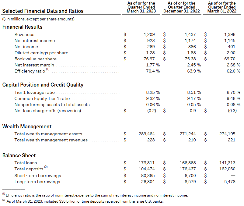 Revenues are roughly $200 million lower for the first quarter 2023 than a year ago, but book value per share is almost $7/share higher. Its Tier 1 and CET1 ratios are healthy, and it even managed to recover some of its previously charged-off loans. These are not numbers that speak to an imminent failure by the bank.