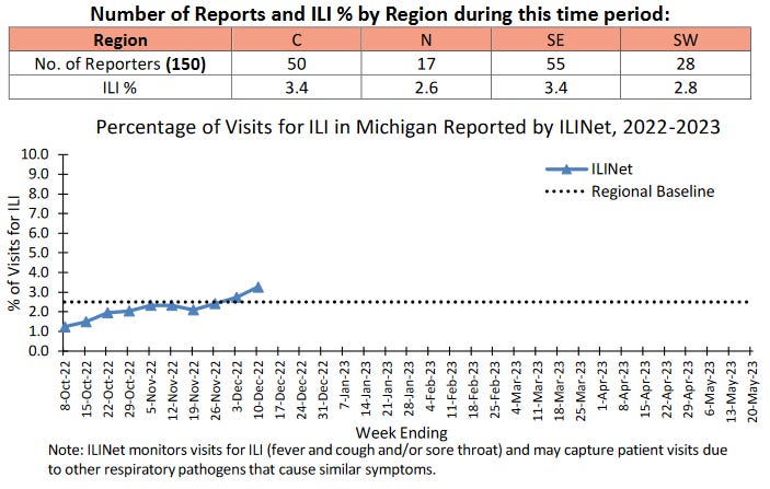 The article date is relevant, because when we look at the Michigan Flu Focus surveillance report for the week ending December 10, we immediately see that, until the week ending December 3, percentages of visits for Influenza-Like Illnesses (ILI) did not exceed the regional baseline percentage.