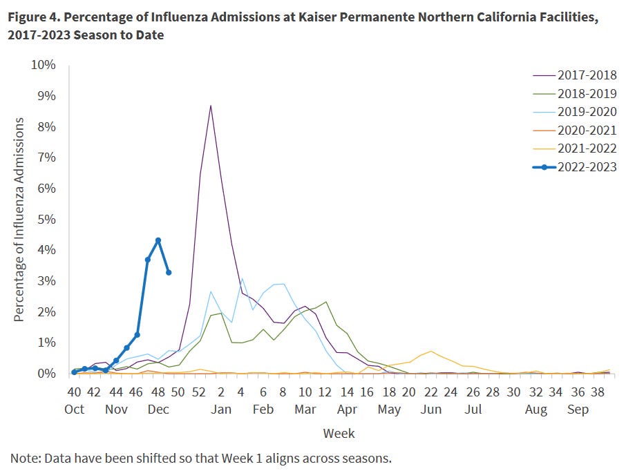 Percentages of hospitalizations at Kaiser Permanente facilities in Northern California for influenza also declined in the most recent reporting week.