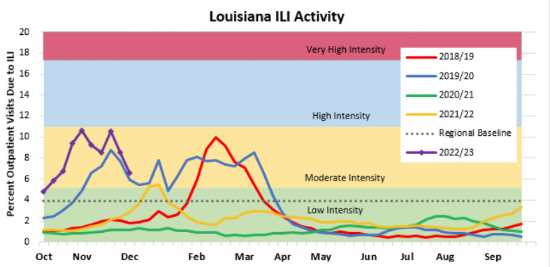 However, according to Louisiana’s Influenza Surveillance Report for the week ending December 10, only 6% of outpatient visits were for influenza-like illness.