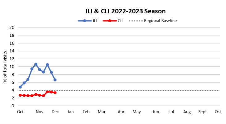 Additionally, COVID-19 surveillance indicates that COVID cases are below the regional baseline, and, as with ILI, are currently declining.