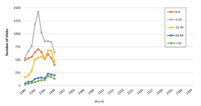 Further undermining the narrative of “soaring” ILI activity, the number of visits are down in the week ending in December 10 across all age groups.