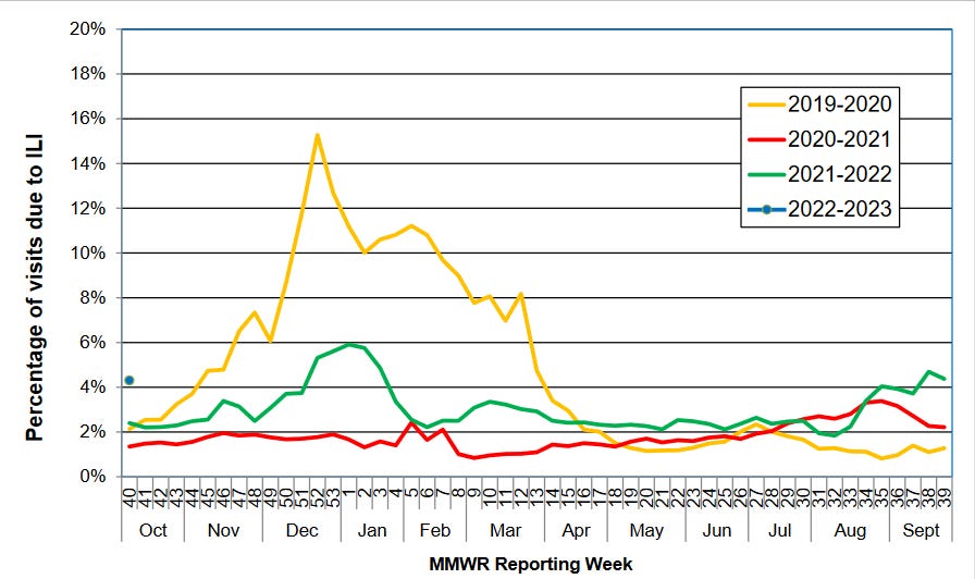 With the 2022-2023 flu season “officially” about to begin1, the first flu season with the COVID-19 “pandemic” over for all practical purposes2, a review of the syndromic surveillance capacities within the United States is in order. Lost in the hysteria of the Pandemic Panic Narrative was the reality that the United States has for years had a regular method of reporting and tracking Influenza-Like Illnesses (ILI).