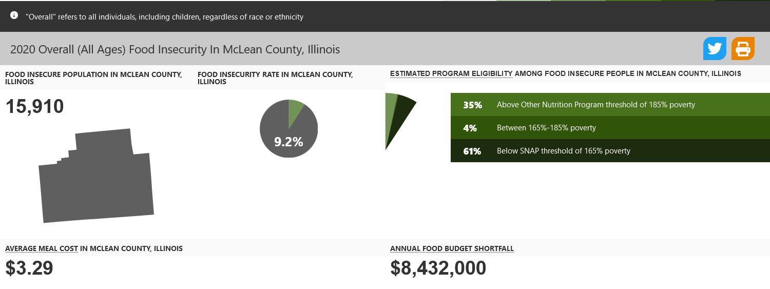 In McClean County, Illinois, 9.2% of the population experienced a measure of food insecurity in 2020, according to the national food bank network Feeding America. This is in spite of more than 25,000 residents receiving federal SNAP (Supplemental Nutrition Assistance Program) benefits by the end of 2020.