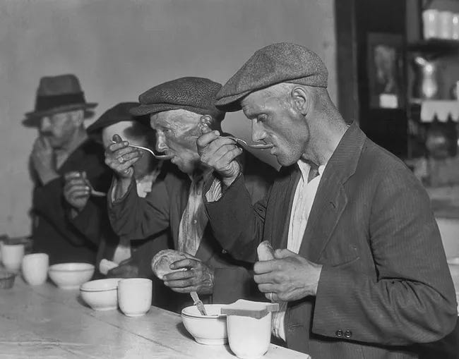 It requires no great imagination nor detailed economic analysis to comprehend that rising privation leads to rising hunger. Indeed, while Germany has its collective and traumatic memory of the Weimar hyperinflation, the food insecurities of the Great Depression hold similar fascination for America—if the wheelbarrow full of cash is emblematic of the Weimar hyperinflation, the soup line and soup kitchen are equally emblematic of America during the Great Depression.