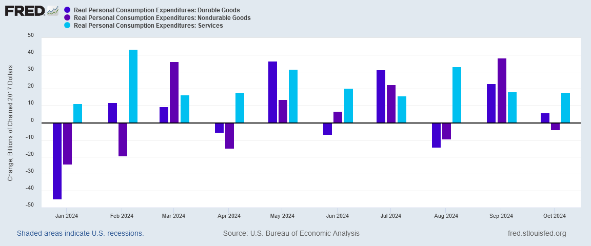 While real expenditures on durable goods did increase during October, real expenditures on non-durable goods declined.