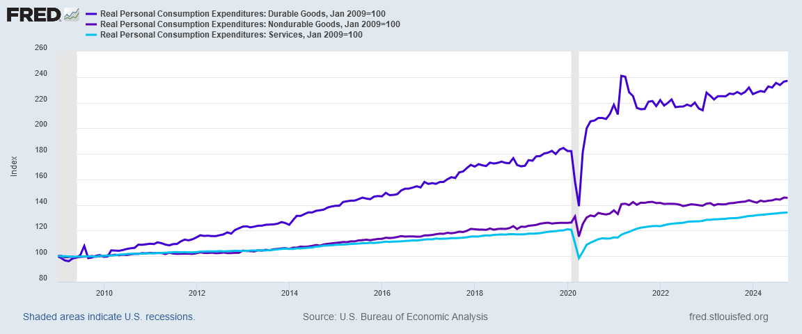 When we index these price elements to the start of the Obama Administration, we see that durable goods inflation has historically been far more significant than service price inflation or non-durable goods inflation.