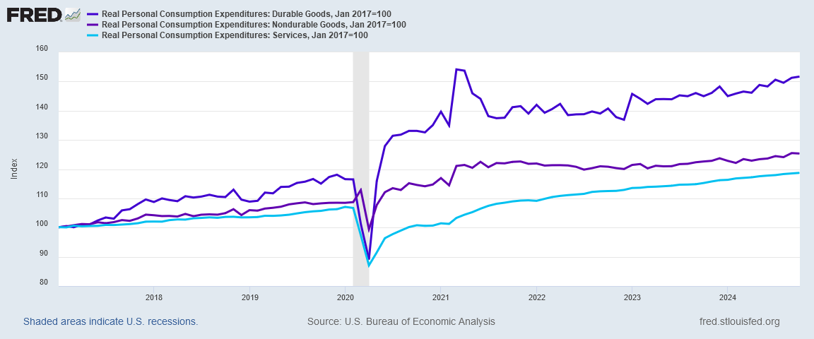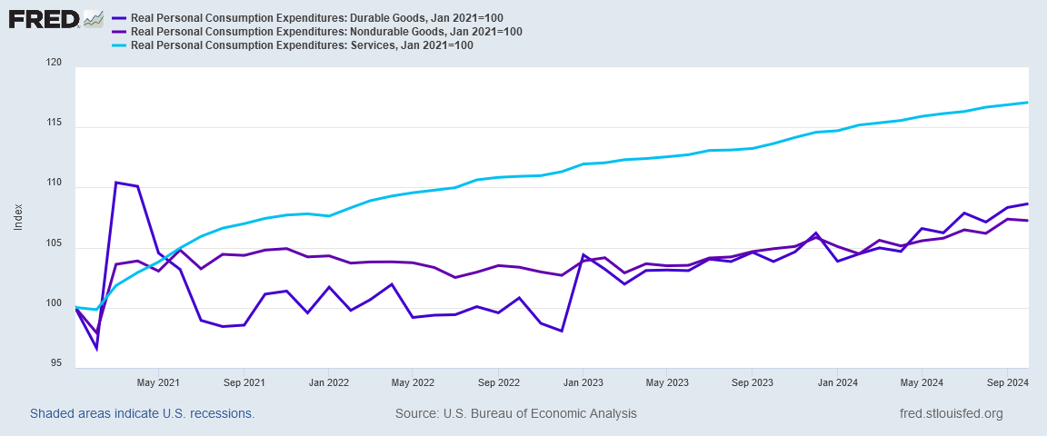 After early 2021, however, as the graph above shows, service prices have increased more dramatically relative to both durable and non-durable goods, and durable and non-durable goods are growing as similar rates.