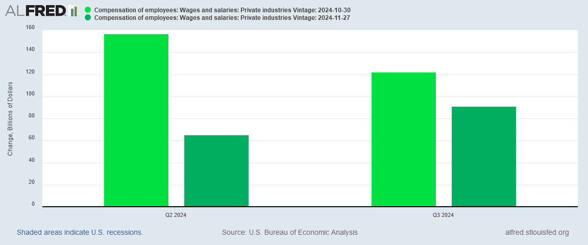 The BEA did much better in the third quarter, overstating private wages in the Advance Estimate by only $30 Billion, or 25% of the Advance Estimate level. Still, between Q2 and Q3, the BEA has managed to make over $100 Billion of private wages and salaries disappear.