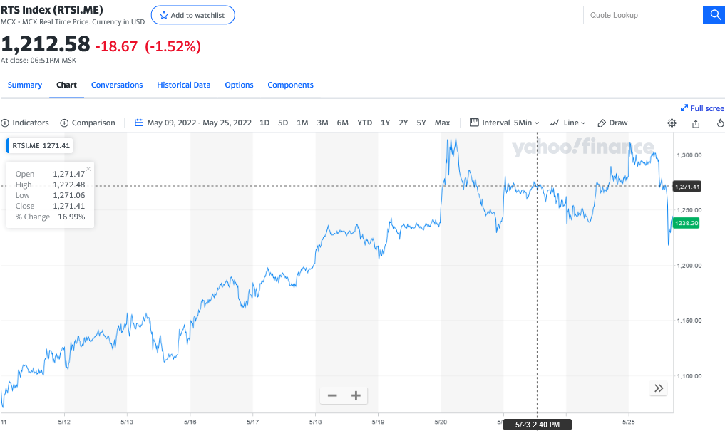 What makes this particularly fascinating is that Yahoo! Finance’s charting displays data for the RTS index going back to May 11…but not any farther back.