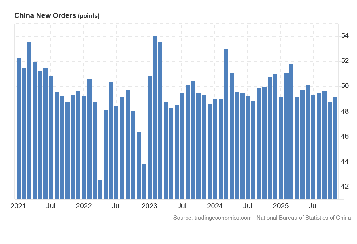Nor is there an indication of a turnaround in manufacturing any time soon. The New Orders sub-component of the overall Manufacturing PMI has also been in contraction with regularity.