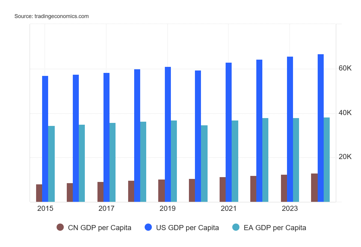 Except for a burst of sales growth during the dislocations immediately following the COVID Pandemic Panic, China has not succeeded in engineering a significant increase in retail sales. China’s households are not increasing their spending relative to overall economic growth, and the per capita GDP figures tell why: they don’t have much in the way of resources with which to spend. Chinese households certainly do not have the resources to drive spending that are found among US and European households.