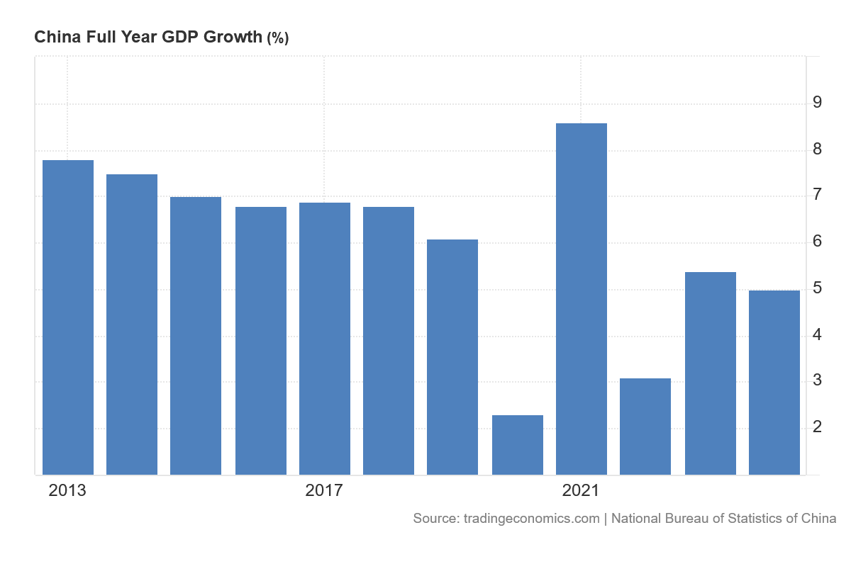 Aside from the extreme growth and contraction swings following the 2020 COVID Pandemic Panic, China’s economy has been growing by less and less each year since at least 2013.