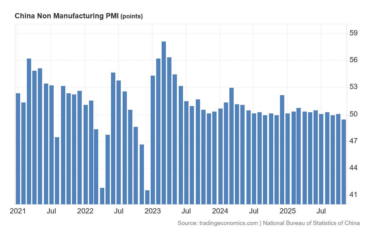 China’s non-manufacturing (services) industries are still expanding, but only just, and in November slipped into contraction. If the trend in the Non-Manufacturing PMI continues, there will be more contraction in China’s future, not less.