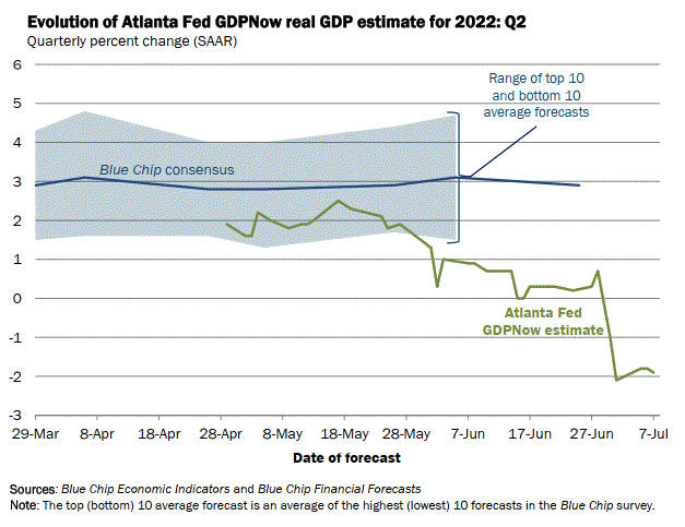 The GDPNow model estimate for real GDP growth (seasonally adjusted annual rate) in the second quarter of 2022 is -1.9 percent on July 7, up from -2.1 percent on July 1. After this week's releases from the Institute for Supply Management, the US Census Bureau, and the US Bureau of Economic Analysis, the nowcasts of second-quarter real personal consumption expenditures growth and real gross private domestic investment growth increased from 0.8 percent and -15.1 percent, respectively, to 1.3 percent and -14.9 percent, respectively, while the nowcast of the contribution of the change in real net exports to second-quarter GDP growth decreased from 0.38 percentage points to 0.21 percentage points.