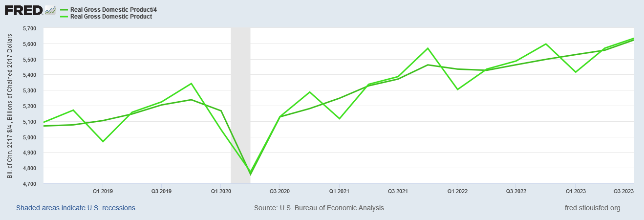 If we index the GDP numbers to the fourth quarter of 2021, we see that from that point until the end of the third quarter of 2023, real GDP grew by a mere 1.2%